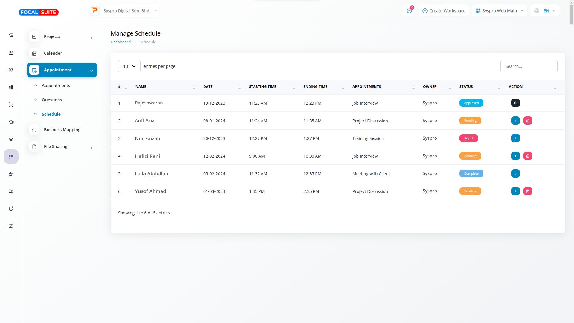 In the schedule section, the details of the completed appointment form are displayed. Here, you can change the appointment status, with options to approve, reject, assign users, mark appointments as complete, and send feedback forms after completion. Once an appointment is approved or rejected, the appointee will be notified via email. A feedback form will also be sent upon completion of the appointment.