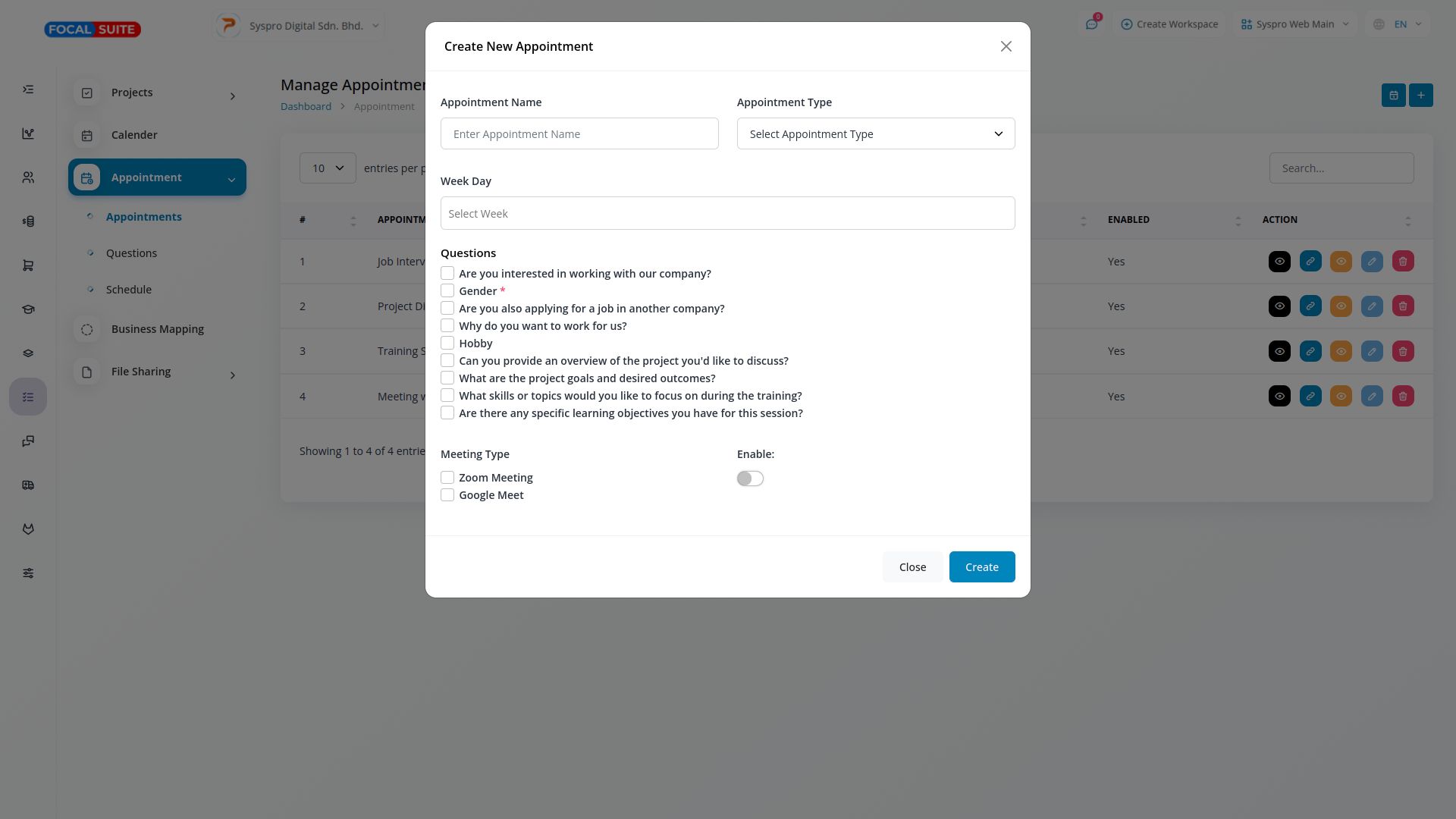 In the appointment section, you can easily create appointments. It includes a calendar button that displays all scheduled appointments and changes color based on their status. Additionally, it features a copy link button, allowing users to share the appointment form for others to fill out effortlessly.